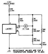 В схеме термометра  используется микросхема LM3911 от фирмы National со встроенным температурным датчиком. Если отсутствует термометр для калибровки, то потенциометр R7 должен устанавливаться в среднее положение. Схема может применяться для контроля температуры в термостате кварцевого резонатора. Если постоянно присоединенный прибор не требуется, то вместо него в схеме можно предусмотреть контрольные точки для подключения мультиметра.