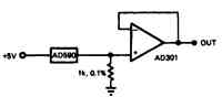 Применение в схеме температурного датчика-микросхемы AD590, который корректируется при производстве, дает в итоге возможность получить большой диапазон измеряемой температуры с использованием минимального количества элементов. Кроме того, других диапазонов температуры можно достичь задавая смещение в буферном операционном усилителе AD301.