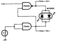 Для настройки схемы термометра параллельно к позистору добавляется сопротивление, с помощью которого устанавливается такое его значение, при котором должен загореться светодиод одного цвета, когда желаемая температура будет достигнута, и другого цвета, если температура слишком низка. В схеме используется красно-зеленый светодиод MV5491 компании Monsanto с питанием +5 В. Сопротивление верхнего по схеме резистора используется на 220 Ом, а для нижнего — 100 Ом, т. к. для двуполярного красно-зеленого светодиода необходимо различное напряжение.