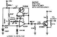 Схема  осуществляет преобразование температура-частота для устройств, которые имеют цифровой вход. Температурным датчиком является диод 1N4148 с температурным коэффициентом 2,2 мВ/°С, который управляет операционным усилителем с релаксационным генератором в обратной связи. Стабилитрон 1N821 стабилизирует напряжение при изменении напряжения питания. Выходная дифференцирующая цепь с конденсатором емкостью 680 пФ и резистором 2,2 кОм формирует на выходе операционного усилителя короткий (400 не) импульс, по заднему фронту отрицательного импульса которого открывается транзистор, выполняющий роль инвертирующего усилителя для получения сигнала ТТЛ-уровня на выходе схемы. Точность преобразователя составляет 0,3 °F.