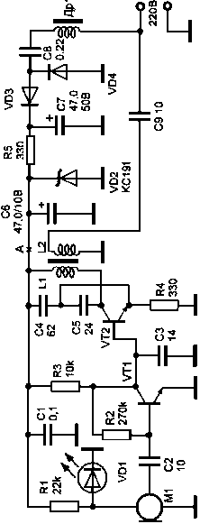 Напряжение сети 220 В поступает на дроссели Др1, Др2 и гасящий конденсатор С2, на котором гасится излишек напряжения. Переменное напряжение выпрямляется мостом VD1, нагрузкой которого является стабилитрон VD2 типа КС510. Пульсации напряжения сглаживаются конденсатором СЗ. Модулирующий усилитель выполнен на транзисторе VT1 типа КТ315. Сигнал звуковой частоты поступает на базу этого транзистора с электретного микрофона с усилителем M1 типа МКЭ-3 или М1-Б2 "Сосна".