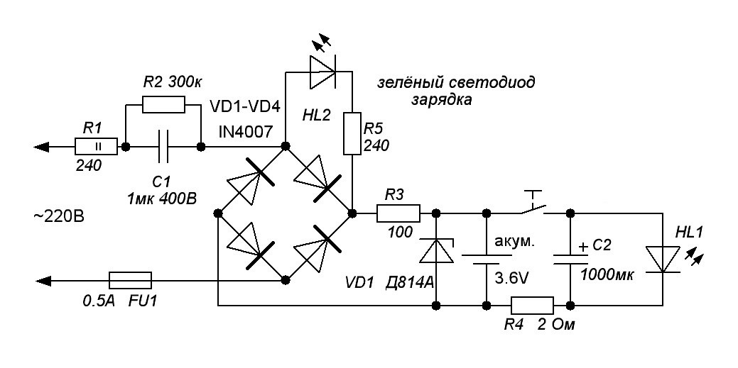 Бестрансформаторная схема состоит из конденсатора и диодного выпрямителя, иногда конденсатор зашунтован высокоомным резистором, который разряжает емкость конденсатора после выключения ночника.