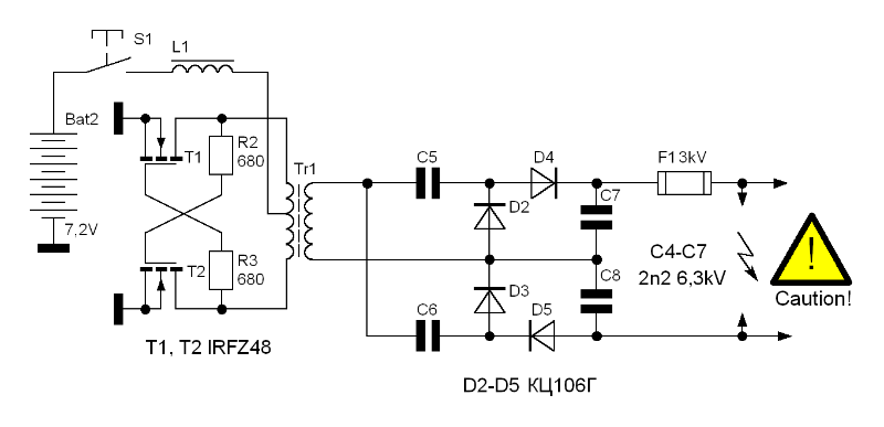 Самым эффективным средством самообороны считается электрошоковое устройство. Оно имеет несколько преимуществ над основными средствами для направленной обороны от нападающих (травматическое оружие, газовые баллончик и т.п.). Конструкций электрошоковых устройств в сети много, мы решили представить свою разработку электрошокера повышенной мощности. Такой вид электрошокера состоит из двух основных частей - высоковольтного преобразователя напряжения и умножителя напряжения.