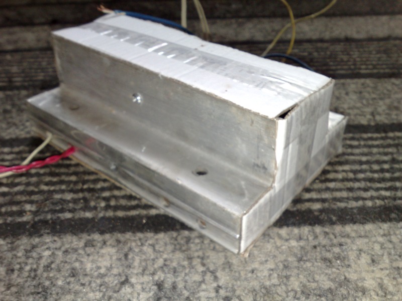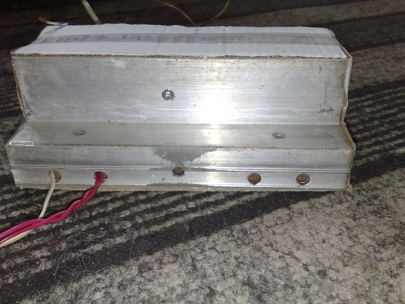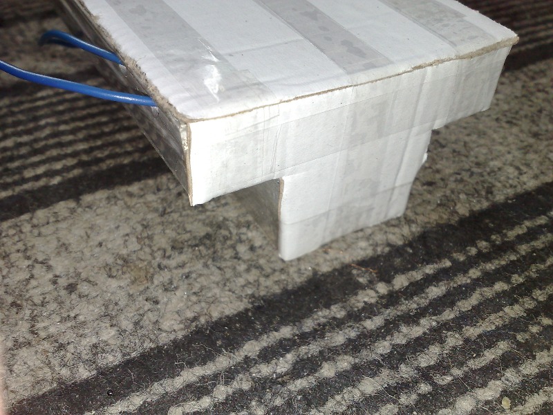 Готовому усилителю нужен был корпус, и поскольку под рукой не было подходящего корпуса, то решил его тоже изготовить на скорую руку. По бокам расположены достаточно большие теплоотводы (в ходе работы почти ледяные), все остальное вырезано из толстого картона.