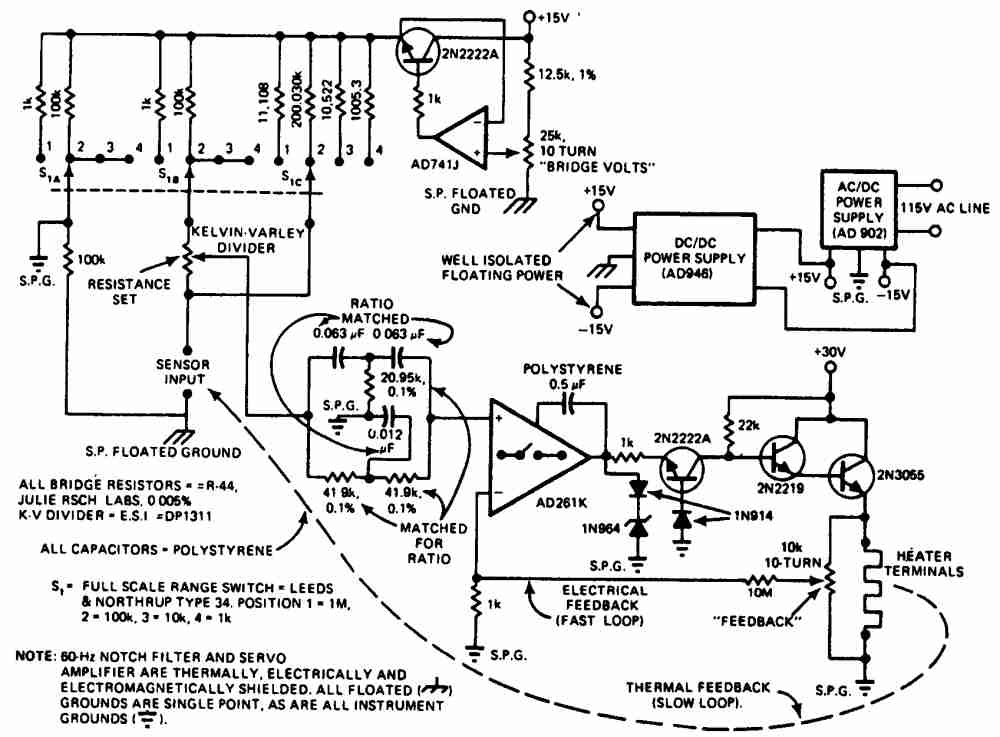 В схеме используется высокоскоростной изолированный усилитель AD261K для высокоточного регулирования температуры лабораторной печи. Многодиапазонный мост содержит датчики с сопротивлением от 10 Ом до 1 мОм с делителями Кельвина—Варлея (Kelvin-Varley), которые используются для предварительного выбора точки управления. Выбор точки правления осуществляется с помощью переключателя на 4 положения. Для питания моста допускается применение неинвертирующего стабилизируемого усилителя AD741J, не допускающего синфазной погрешности напряжения. Пассивный фильтр на 60 Гц подавляет помехи на входе усилителя AD261K, который питает транзистор 2N2222A. Далее питание поступает на пару Дарлингтона и подводится 30 В к нагревательному элементу.