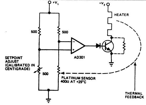 В мостовой схеме регулятора используется платиновый датчик. Сигнал с моста снимается операционным усилителем AD301. который включен как дифференциальный усилитель-компаратор. В холодном состоянии сопротивление датчика менее 500 Ом, при этом выход операционного усилителя приходит в насыщение и дает положительный сигнал на выходе, который открывает мощный транзистор и нагревательный элемент начинает греться. По мере нагревания элемента растет и сопротивление датчика, которое возвращает мост в состояние уравновешивания, и нагрев выключается.
