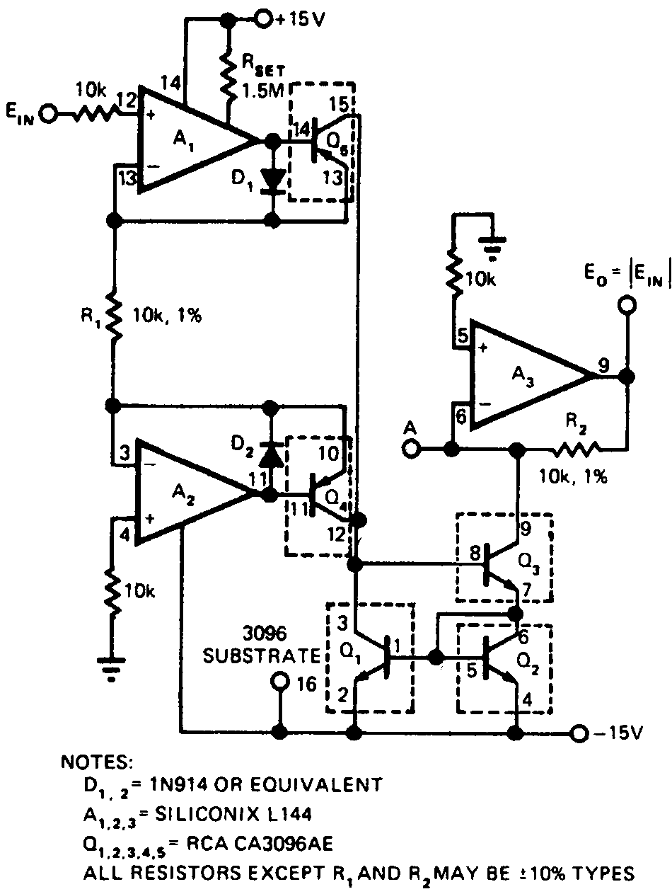 Операционные усилители А1 и A2 схемы (рис.), взаимодействуя вместе с р-п-р-транзисторами, образуют выпрямитель с токовым выходом. Преобразователь "ток-напря жение", выполненный на операционном усилителе А3, для масштабирования использует резистор R2. Диапазон входного напряжения определяется синфазными значениями напря жения, используемого операционного усилителя, и характеристиками пробоя составляю щих элементов схемы. Приведенная схема может применяться для измерения постоянного напряжения входного сигнала, изменяющегося в диапазоне ±10 В.