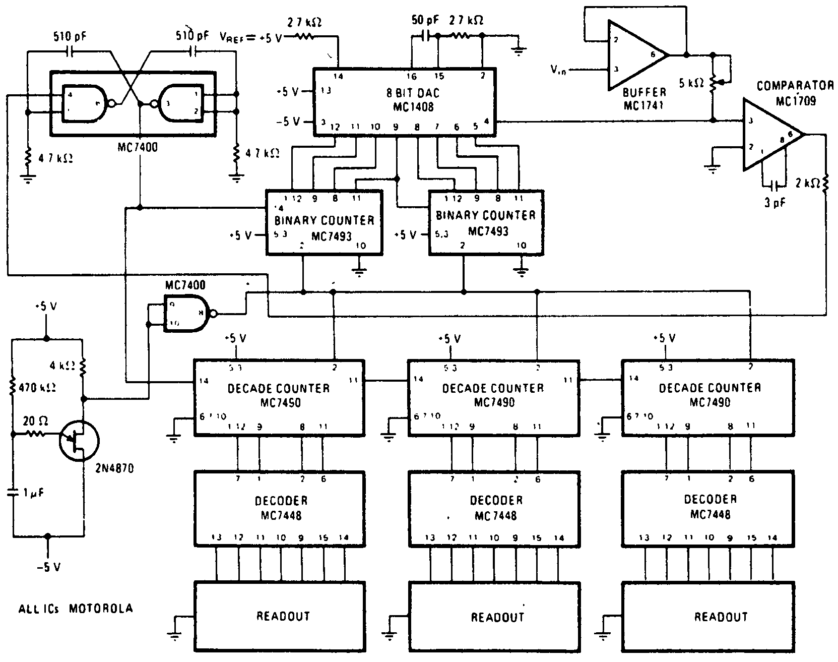 Система с обратной связью, которая проектировалась для 8-битного цифроаналогового пре образователя МС1408 производства компании Motorola (рис.), использует синхронизированный двоичный счетчик МС7493, чтобы сформировать на выходе преобразователя функцию ступенчатого напряжения. Напряжение на выходе преобразователя с помощью компаратора МС1709 сравнивается с измеряемым входным напряжением V,N, после чего тактовый генератор импульсов останавливается, если уровни напряжений одинаковы. Так товый генератор синхроимпульсов с частотой 330 Гц выполнен на двух логических элемен тах И-НЕ микросхемы МС7400. Генератор на однопереходном транзисторе 2N4870 уста навливает обе группы счетчиков, и измеряемое напряжение считывается в течение 0,5 секунд. Двоично-десятичный 7-сегментный дешифратор МС7448 преобразовывает вы ходы двоично-десятичных счетчиков МС7490 в формат светодиодного дисплея. С приве денными на схеме значениями измерительный прибор Может измерять напряжения вплоть до 2,55 В с шагом 10 мВ. Для измерения других предельных напряжений нужно либо при менить делитель напряжения на входе схемы, либо заменить входной буферный усилитель с фиксированным единичным усилением МС7441 на усилитель с изменяемым коэффициен том усиления.
