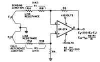 У прецизионного операционного усилителя ОР-07А производства фирмы Precision Monolithics имеется высокий коэффициент подавления синфазной составляющей, малый ток утечки, долговременная температурная стабильность, необходимая для приложений с использованием термоэлементов, полный размах сигнала которых составляет не более 50 мВ, в промышленной среде с помехами. Если отношения R2 / R1 и R4 / R3 подобраны в пределах 0,01%, то коэффициент ослабления синфазного сигнала составляет 100 дБ при полном диапазоне ±13 В. Схема может использоваться во многих других приложениях, где низкочастотные сигналы слабых источников должны усиливаться при наличии больших синфазных сигналов.