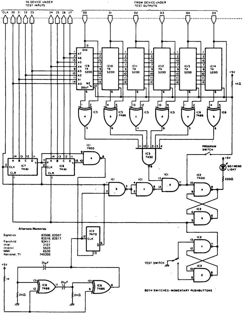 Схема предоставляет возможность автоматического, непосредственного и основательного тестирования логических элементов малой степени интеграции, инверсных триггерных схем и т. д. А также счетчиков среднего уровня интеграции, регистров-защелок, регистров сдвига и т. д. Схема посылает входные данные для испытываемого прибора (DUT — Device Under Test) по 9 проводам и получает данные по 6 проводам. Когда переключатель "TEST SWITCH" замкнут и находится в нижнем по схеме положении, двоичный счетчик IC7—1С8, который включает входные провода испытываемого прибора, возвращается в исходное состояние и срабатывает триггер, который включает светодиод "GO / NO GO" (Работает/Не работает). После возвращения переключателя "TEST SWITCH" в исходное верхнее по схеме положение запускается счетчик по всем 256 входным состояниям. Во время подсчета данные в проводах выхода будут сравниваться с данными запоминающего устройства на микросхемах IC9—1С 14. Если встречается несоответствие, то триггер "GO/NO GO" сбрасывается на этом месте счетчика, вход сброса триггера тактового генератора устанавливается на низкий уровень и следующий подсчет подавляется до тех пор, пока снова не будет нажат переключатель "TEST SWITCH". Если светодиод "GO/NO GO" продолжает светиться, то деталь выдержала тест. Для программирования переключатель "PROGRAM SWITCH" должен быть нажат во время тестирования заведомо хорошего прибора.