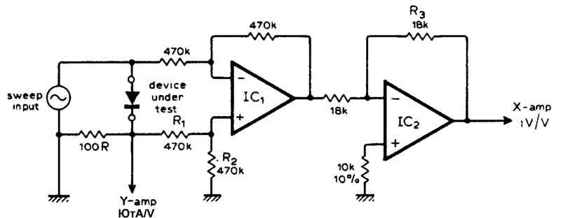 Схема разрабатывалась для того, чтобы воспроизводить кривые характеристик напряжения/тока диодов или других комплектующих изделий с использованием 2-входо-вого осциллографа. Напряжение развертки может быть любым небольшим переменным напряжением, например, 20 В от регулируемого трансформатора. Тестируемые изделия с 3 выводами так же могут быть проверены, если использовать внешнее напряжение смещения. В качестве операционных усилителей 1С1 и 1С2 используется микросхема типа 741.