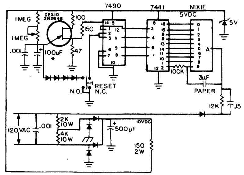 Таймер времени идентификации радиолюбительской станции использует один цифровой знаковый индикатор тлеющего разряда для отображения прошедшего времени от начала передачи в минутах. После 9 мин цифра "9" индикатора, прежде чем превратится в "О", мигает в течение 60 сек, как визуальное напоминание, что любительская станция должна быть уже идентифицирована. В схеме можно использовать однопереходной транзистор типа 2N2646, диоды типа 1N4001 или эквивалентные. Интенсивность мигания цифры "9м знакового индикатора зависит от значения ЮО-килоомного сопротивления, которое подключено к выводу 9.