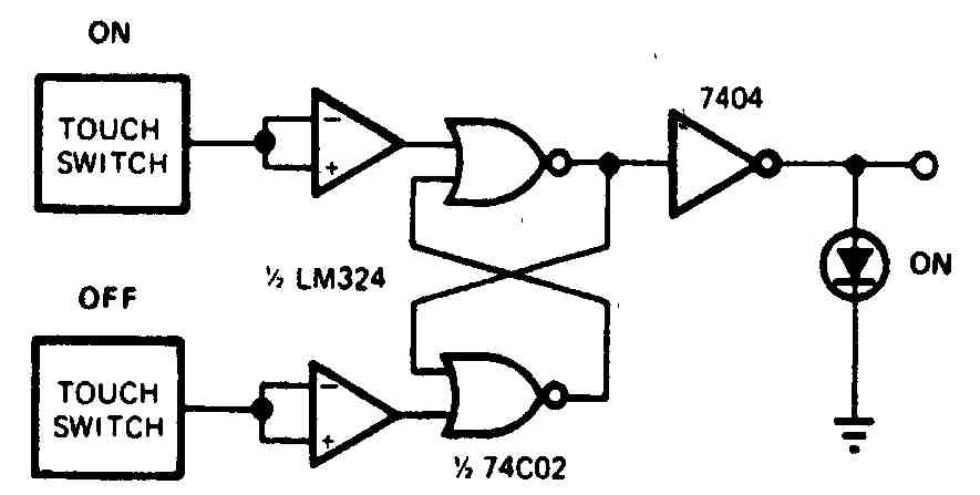 При касании медной площадки "ON" (Вкл) размером 0,5 дюйм2, расположенной на печатной плате, сигнал на выходе схемы (рис. 5.4) переключается на высокий логический уровень, т. е. включается. При касании другой пластинки "OFF" (Выкл) переключатель меняет свое состояние на противоположное — выключается. Светодиод, включенный между выходом схемы и общим проводом, показывает состояние переключателя. Для безупречной работы схема должна быть запитана от источника постоянного тока.