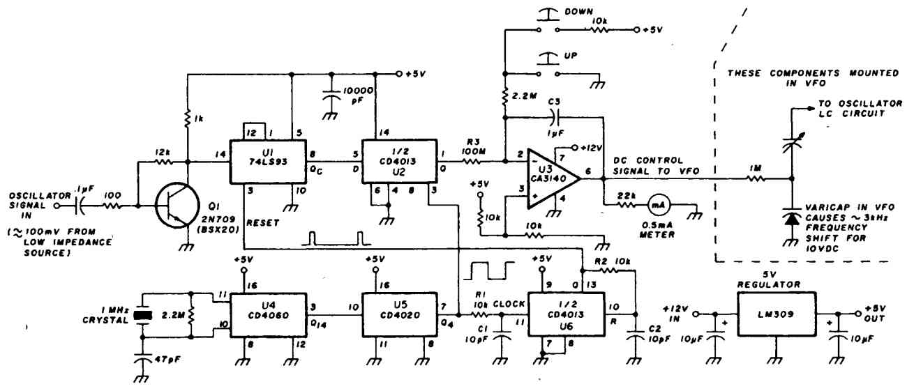 Температурный дрейф частоты генератора приемопередатчика с генератором перестраиваемой частоты автоматически корректируется двоичным счетчиком U1 схемы (рис.) в интервале 0,26 сек (3,81 Гц), который определяется задающим кварцевым генератором на кварце с частотой 1 МГц и делителем на микросхемах U4—U5. С помощью кнопок "UP" (Вверх) и "DOWN" (Вниз) указанный интервал времени используется для приведения выхода интегратора U3 с пассивными времязадающими элементами R3C3 в рабочий диапазон после включения вручную.