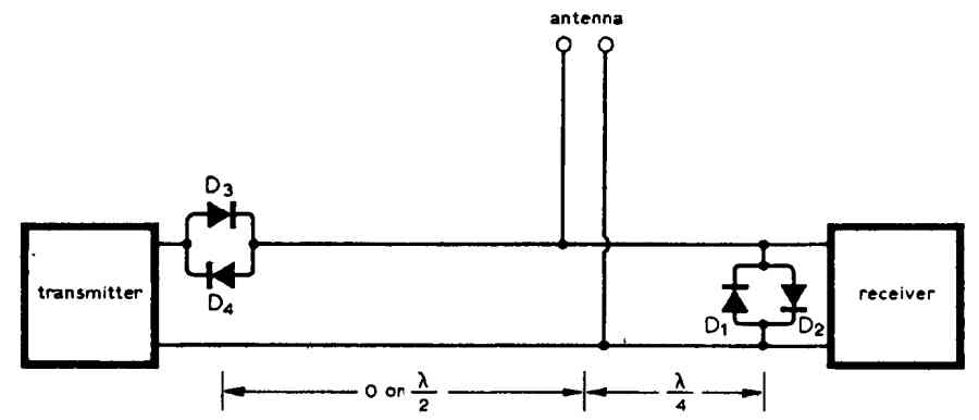 В схеме (рис.) используется только 2 пары диодов высокой частоты с определенными электрическими параметрами для излучаемой мощности. С помощью диодной пары со стороны передатчика сопротивление бесконечно велико во время приема. В направлении приемника провод подобран так, что вся входящая мощность поступает в приемник. Если передатчик включен, то диоды D3 и D4 пропускают ток и мощность идет в направлении антенны, в то время как диоды D1 и D2 также пропускают и замыкают накоротко вход приемника.