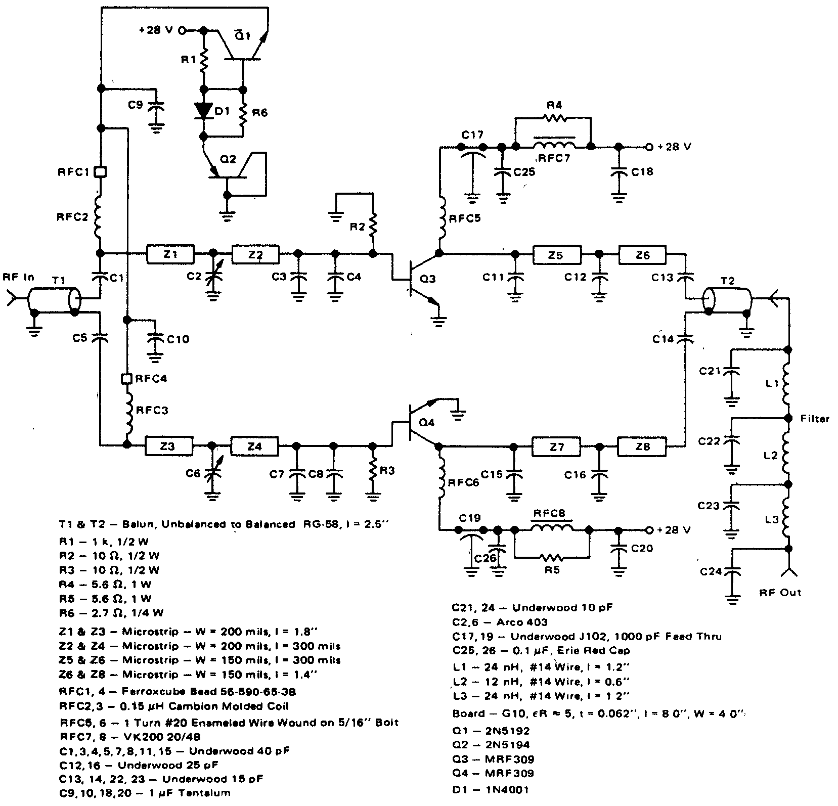 Для возбуждения двух транзисторов Q3 и Q4 типа MRF309 и получения на выходе схемы (рис. 7.17) в режиме передачи мощности равной 100 Вт требуется подать на вход схемы сигнал мощностью 16 Вт. Схема при питании от источника постоянного тока напряжением 28 В обеспечивает усиление мощности на 8 дБ с 40%-ной эффективностью. Гармоники, которые могут быть при работе двухтактном режиме, эффективно подавляются на выходе 7-ступенчатым фильтром нижних частот. На транзисторы Q3 и Q4 подается напряжение смещения со стабилизатора на транзисторах Q1 и Q2. Транзисторы Q3 и Q4 должны монтироваться на радиаторе с изолируемой слюдяной шайбой. Т1 и Т2 — трансформаторы, изготовленные из коаксиального кабеля типа RG-58. Длина составляет 3 дюйма. По '/д-дюйма в каждом конце обрабатываются таким образом, что общая длина трансформатора составляет 2!/2-дюйма.