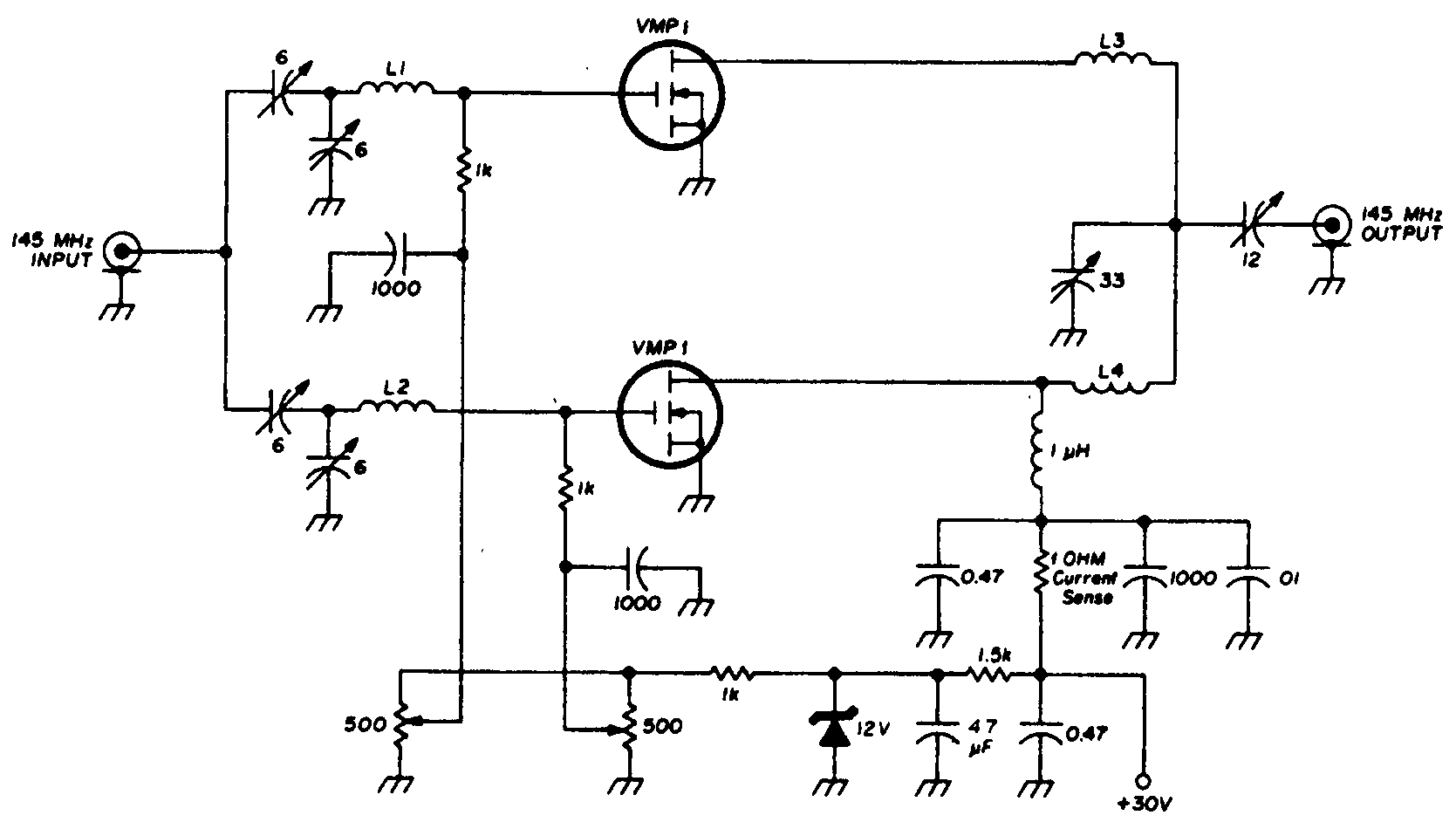 Линейный усилитель на двух мощных полевых МОПттранзисторах типа VMP1 (рис. 7.22) предназначен для приемопередатчика 2-метрового диапазона и обеспечивает 10 Вт пиковой мощности. Катушки индуктивности L1 и L2 схемы им^ют по 8 витков. Катушки L3 и L4 намотаны вплотную эмалированным проводом № 20 по 5 витков на 3-миллиметровом сердечнике. Транзисторы нуждаются в радиаторе и изолируются от шасси (каркаса) с помощью шайб из оксида бериллия с толщиной 0,062 дюйма. Эффективность (КПД) усилителя составляет примерно 40 %.