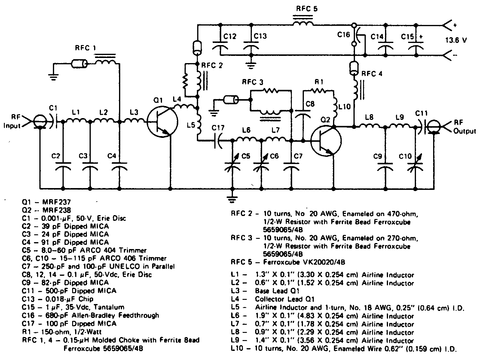 Усилитель на 2 транзисторах (рис. 7.56) обеспечивает усиление 20 дБ для морских, любительских и коммерческих УКВ-передатчиков. Подстроечные конденсаторы (триммеры) устанавливаются на максимальный выходной сигнал в середине используемого диапазона, который представляет интерес. Возможен режим с рассогласованием 30:1 без возникновения неисправности.