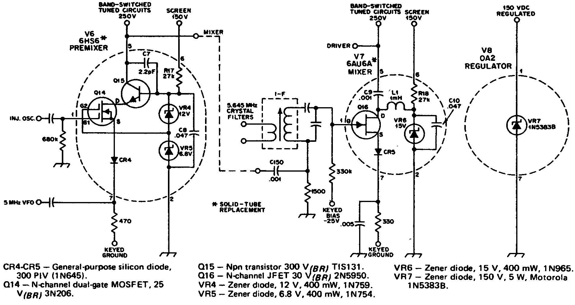 Каскад лампового предварительйого смесителя V6 (рис. 7.63) в передатчике Т-4ХВ компании Drake заменяется на полевой транзистор Q14 с двойным затвором. Диод CR4 защищает полевой транзистор от схемы "KEyED-GROUND". Смеситель V7. с высоким уровнем напряжения, работает при большом динамичном диапазоне сигналов, которые поступают от ПЧ-каскада. На выходе смесителя имеется относительно низкий уровень эффективного напряжения где-то не более 4 В. Развязывающий конденсатор С9 и дроссель L1 разделяют полевой транзистор с управляющим от высоких напряжений ламповой схемы.