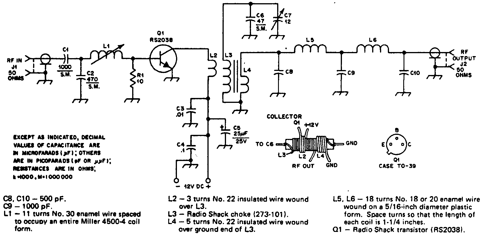 Схема усилителя (рис. 7.72) проектировалась для применения совместно с маломощным передатчиком (QRP) при наличии плохих условий в используемой полосе частот. Для работы требуется входной сигнал мощностью примерно 350 мВт. Полуволновой фильтр на выходе схемы необходим для подавления гармоник. Для транзистора Q1, используемого в схеме, требуется радиатор.