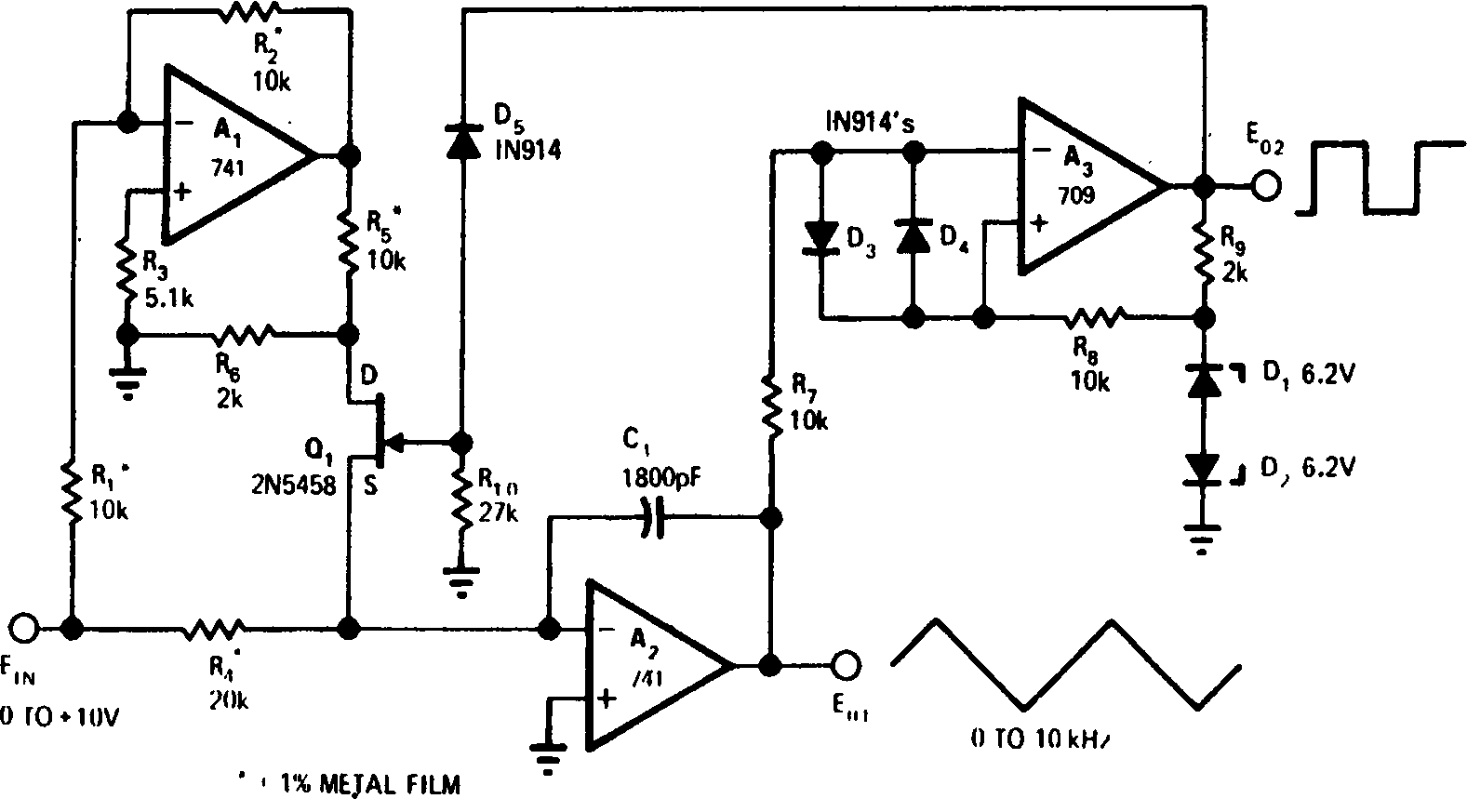 Схема (рис.) обладает хорошей стабильностью и превосходной линейностью в широком рабочем диапазоне. С приведенными на схеме значениями и +15-вольтовым питанием функция преобразования будет около 1 кГц/В во всем диапазоне частот от 0 до 10 кГц при погрешности линейности — меньше 0,5 %. Хотя схема на выходе не имеет синусоидальный сигнал, но при необходимости с помощью фильтрации и подавления гармоник сигнал тре угольной формы может быть преобразован в синусоидальный.