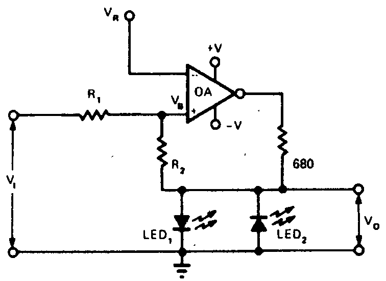 Визуальное отображение уровней напряжения в схеме (рис.) достигается с помощью двух светодиодов типа TIL203, трех сопротивлений и любого операционного усилителя, который может обеспечивать выходной ток, равный 15 мА. Если входное напряжение пре восходит верхнее предельное положительное значение кратковременно или длительно, то включается светодиод LED1. В том случае, когда небольшой положительный уровень на пряжения падает, светодиод LED1 выключается. Если же входное напряжение будет ниже отрицательного предельного значения, то тогда включится светодиод LED2. Чтобы при уровнях +2 В включить светодиод LEDb а при -1,2 В светодиод LED2, оба сопротивления R1 и R2 должны быть по 10 кОм.
