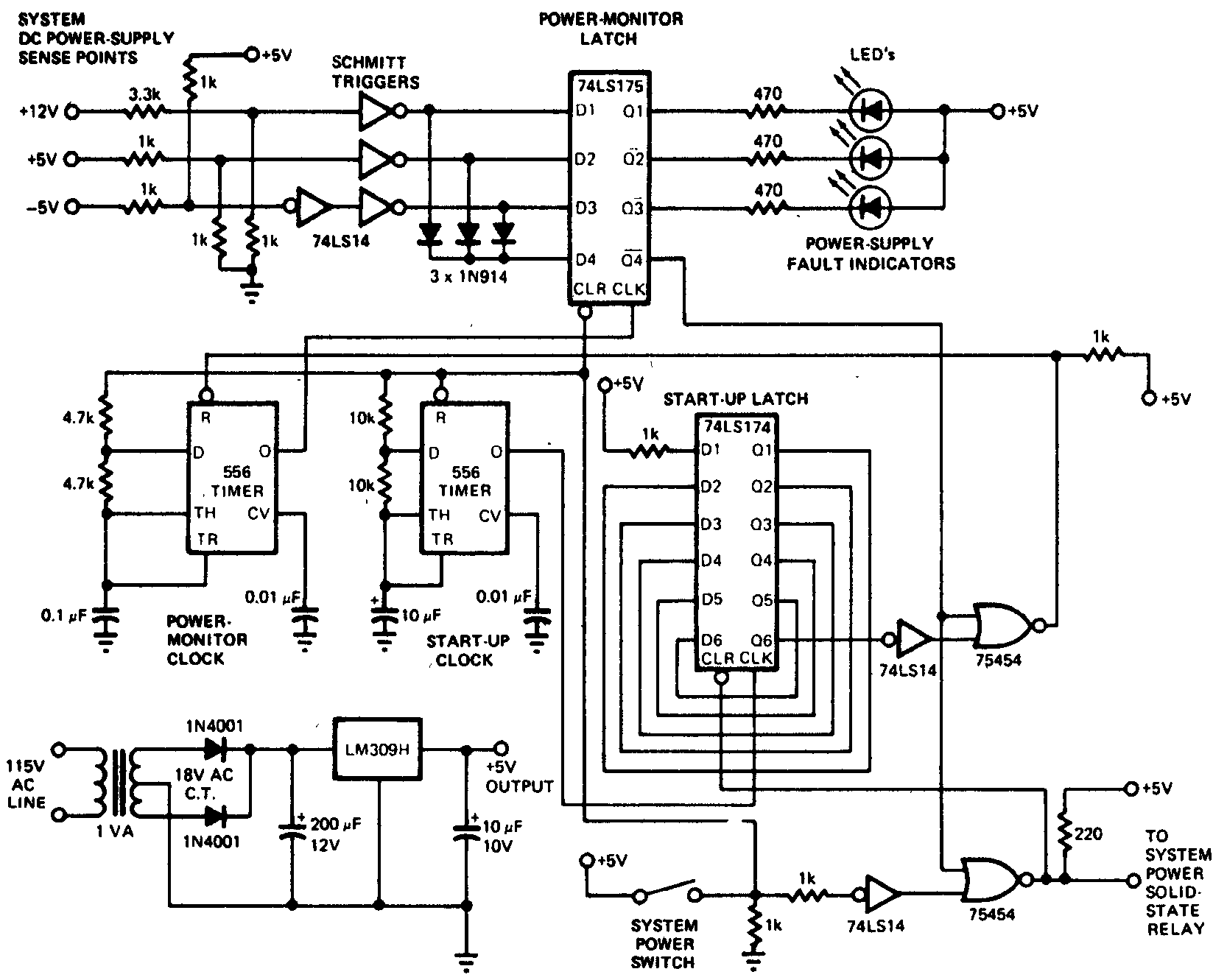 Схема (рис.) разработана для применения в системах, у которых имеется несколько напряжений, поступающих от источника питания постоянного тока, для того, чтобы избе жать возможных повреждений, если одно из этих напряжений будет ниже допустимого уровня, в то время как другое будет в норме. Схема контроля имеет свой собственный неза висимый источник питания, который гарантирует защиту, даже тогда, когда выключаются устройства, содержащие ОЗУ и МОП-компоненты. При неисправности в источнике питания переменного тока вся система выключается полностью. Схема при необходимости может быть легко адаптирована для любого количества источников питания путем добавления делителей напряжения, триггеров Шмитта, диодов и защелок. Включение выключателя для системного источника питания активизирует полупроводниковое реле, которое подает на пряжение к основному источнику питания. Половина микросхемы сдвоенного таймера типа 556 и D-защелка 74LS174 предотвращают контроль напряжения до тех пор, пока источники питания не стабилизировались в течение 500 мс. Другая половина микросхемы 556 обеспе чивает тактовую частоту для узла защелки контроля питания "POWER-MONITOR LATCH". Система работает нормально до тех пор, пока на все D-входы узла "MONITOR-LATCH" поступают сигналы логического "0". Если источник питания выходит из строя, то уровень логической "1" появляется у соответствующего входа защелки и следующий синхроим пульс запускает отключение системы. При этом горящий светодиод будет показывать на неисправное напряжение источника питания.