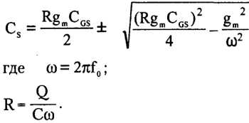 В приведенной формуле CGS состоит из суммы внутренней и внешней емкостей, a gm - активная динамическая проводимость, которую транзистор представляет для тока стока, определяемого сопротивлением Rs. Условия возникновения колебаний выполняются, если CGS > 2CA/Q и значение емкости Cs находится в области, заключенной между двумя решениями уравнения: