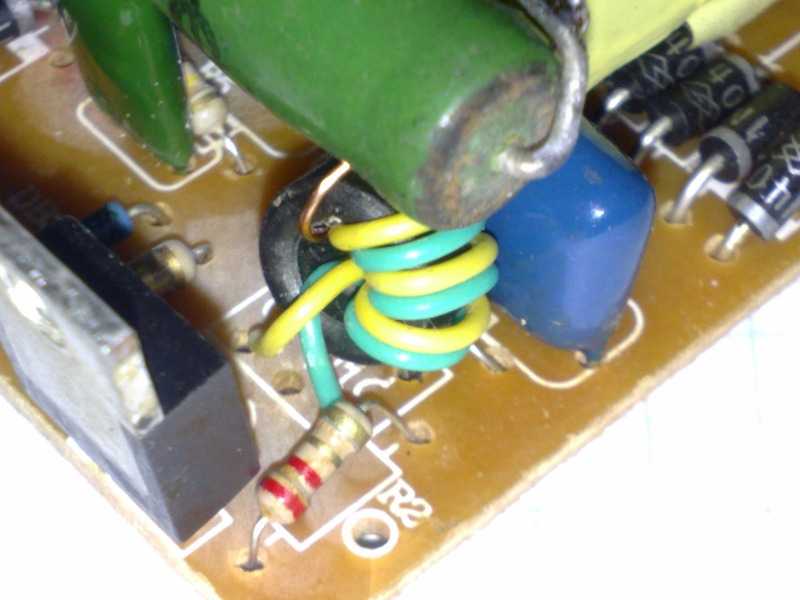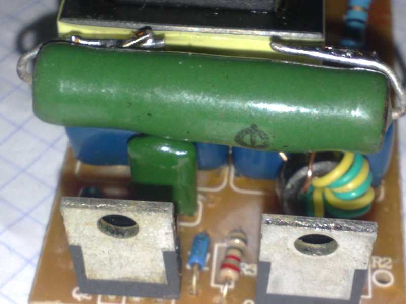 Дальше нужно поискать резистор с сопротивлением 3-8 Ом (от его величины зависит срабатывания защиты от КЗ). Далее берем провод с диаметром 0,4-0,6мм им мотаем два витка на на импульсном трансформаторе, затем 1 виток на трансформаторе ОС. Резистор ОС подбираем с мощностью от 1 до 10 ватт, он будет перегреваться и достаточно сильно. В моем случае использован проволочный резистор с сопротивлением 6,2Ом, но не советую использовать их, поскольку проволока имеет некоторую индуктивность, что может повлиять на дальнейшую работу схемы, хотя точно сказать не могу - время покажет.