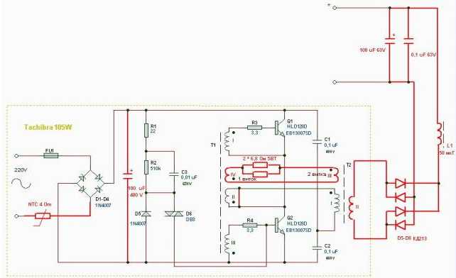 Схемы лишены защиты от КЗ на выходе импульсного трансформатора. Еще одним недостатком схемы является то, что генерация происходит только тогда, когда на вторичную обмотку трансформатора подключают нагрузку определенной величины. Я решил сегодня написать статью, поскольку считаю, что ЭТ может быть использован в радиолюбительских конструкциях в качестве источника питания, если внести некоторые альтернативные решения в схему ЭТ. Суть переделки - дополнить схему защитой от КЗ и заставить ЭТ включаться при подаче сетевого напряжения.