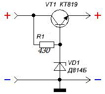 Стабилизатор имеет достаточно простую схему и состоит всего из трех компонентов. Вся схема держится на мощном биполярном транзисторе серии КТ819, хотя можно ставить любые другие аналогичные биполярные транзисторы (обратной проводимости). Стабилитрон взят достаточно мощный КД84Д. Резистор с сопротивлением 430 Ом можно ставить и с меньшей мощностью, в ходе работы греется слабо.