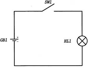 Пожалуй, простейшая и наиболее наглядная схема, которую можно только представить, включает небольшую лампочку, подключенную к источнику питания. Однако столь нехитрая электрическая цепь имеет один существенный недостаток — лампа в ней будет все время включена. Для того чтобы внести в схему возможность включения и выключения лампы, достаточно просто добавить в нее ключ. Принципиальная схема такой простой электрической цепи изображена на рис.