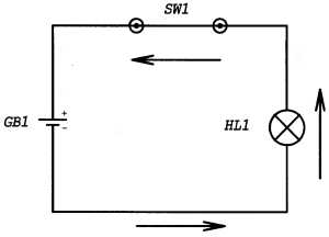 В приведенной схеме ключ изображен в замкнутом положении. В нем ключ замыкает петлю из проводников и позволяет электронам перемещаться от отрицательного вывода источника питания (в нашем случае — батареи) к положительному. Внутри стеклянной колбы лампа содержит нить накаливания, которая, разогреваясь от проходящего тока, излучает видимый свет. (Здесь и далее стрелками на рисунках показано направление движения электронов (обратное общепринятому электрическому току).)
