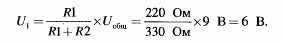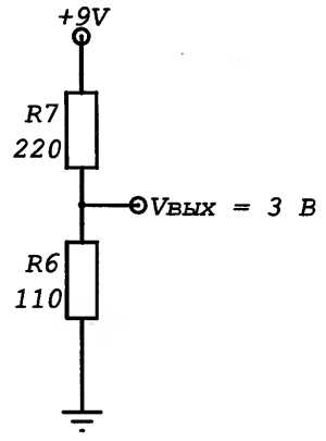 Явление падения напряжения успешно применяется в схеме делителя напряжения, которая служит для понижения потенциала в тех узлах устройства, где требуется получить напряжение меньшее, чем выдает источник питания. Эта простая схема изображена на рис. 7.6. есть, к примеру, нужно запитать транзистор напряжением 3 В, но имеющийся источник питания выдает напряжение 9 В. Уменьшить уровень напряжения легко при помощи делителя.