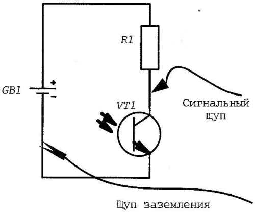 5. Подсоедините тестовый щуп осциллографа к точке между транзистором и резистором.