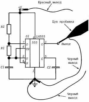 Логический пробник имеет четыре вывода (рис. 10.4). Красный и черный выводы с зубчатыми зажимами (в простонародье— "крокодилами") нужно подключить к земле тестируемой схемы и ее питанию.