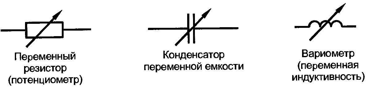 Переменный резистор. Его еще называют потенциометром или просто переменником. Наверное, это наиболее используемый в электронике тип подстраиваемого радиоэлемента: потенциометры применяют в качестве регуляторов громкости звука, реостатов систем освещения и в сотнях других приложений. Переменный резистор состоит из элемента с определенным сопротивлением, намотанного между двумя выводами (как спираль в лампе накаливания). Вдоль этой спирали скользит третий контакт, посредством которого и меняется сопротивление всего элемента, когда кто-то вращает регулятор. Символ, которым обозначают потенциометр, изображен на рис. 6.8.