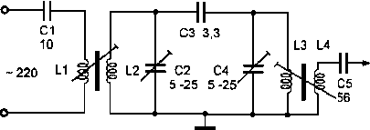 Конденсатор С1 исключает проникновение напряжения сети в катушку L1 и на вход используемого приемника. Катушки L2, L3, L4 и конденсаторы С2, СЗ, С4 образуют двухконтурный ФСС. С катушки L4 отфильтрованный сигнал поступает на вход приемника. Катушки L1, L2, L3, L4 намотаны на каркасах от KB катушек переносных радиоприемников. Катушка L1 имеет 2 витка, L2 - 14 витков, L3 - 14 витков, L4 - 5 витков. Все катушки намотаны проводом ПЭВ 0,23.