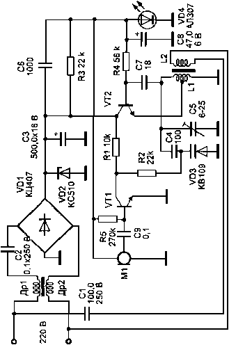 Напряжение сети 220 В поступает на дроссели Др1, Др2 и гасящий конденсатор С2, на котором гасится излишек напряжения. Переменное напряжение выпрямляется мостом VD1, нагрузкой которого является стабилитрон VD2 типа КС510. Пульсации напряжения сглаживаются конденсатором СЗ. Модулирующий усилитель выполнен на транзисторе VT1 типа КТ315. Сигнал звуковой частоты поступает на базу этого транзистора с электретного микрофона с усилителем M1 типа МКЭ-3 или М1-Б2 "Сосна".
